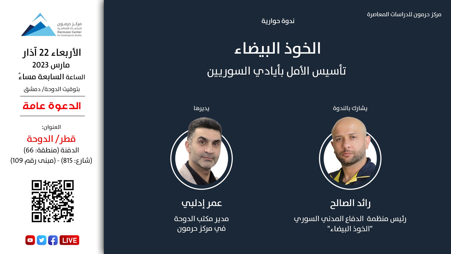 يعقد مركز حرمون للدراسات المعاصرة، يوم الأربعاء 22 آذار/ مارس 2023، الساعة السابعة مساءً بتوقيت دمشق، ندوة حوارية بعنوان “الخوذ البيضاء.. تأسيس الأمل بأيادي السوريين“، يُشارك فيها رائد الصالح، رئيس منظمة الدفاع المدني السوري “الخوذ البيضاء”، ويديرها عمر إدلبي، مدير مكتب الدوحة في مركز حرمون.