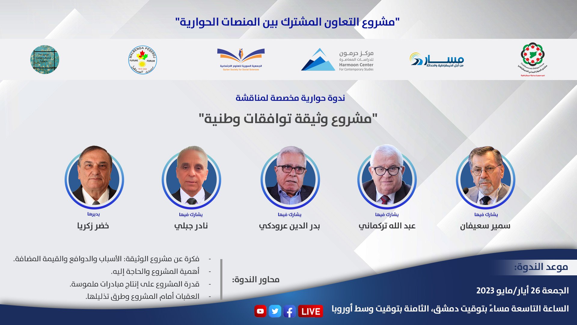 تتشرف اللجنة التنفيذية لمشروع التعاون المشترك بين المنصّات الحوارية: مركز حرمون للدراسات المعاصرة/ برنامج الحوار الوطني، ومنتدى الحوار المدني الديمقراطي/ مدى، والجمعية السورية للباحثين في العلوم الاجتماعية، ومنظمة مسار للديمقراطية والحداثة، ومنتدى المستقبل، والمنتدى الدستوري، بدعوتكم يوم الجمعة 26 أيار/ مايو 2023، الساعة التاسعة مساءً بتوقيت دمشق، الثامنة بتوقيت وسط أوروبا، للمشاركة في الندوة الحوارية المخصصة لمناقشة “مشروع وثيقة توافقات وطنية”، الذي أصدره مركز حرمون للدراسات المعاصرة.