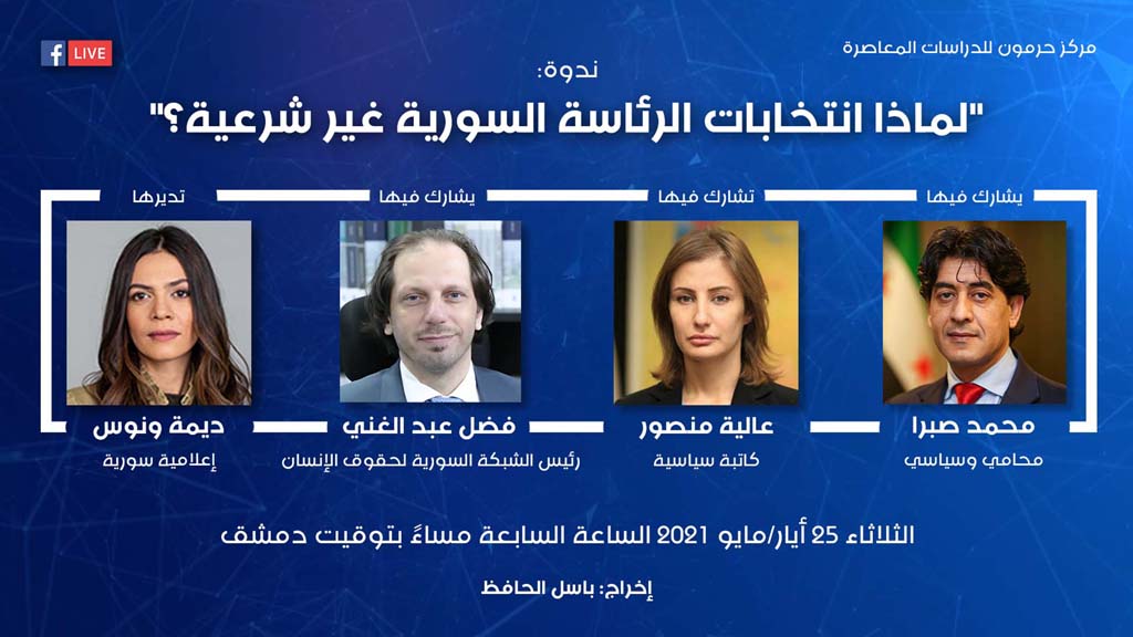 ضمن سلسلة الندوات التي يعقدها مركز حرمون للدراسات المعاصرة عبر البث المباشر، تُقام يوم الثلاثاء 25 أيار/ مايو 2021، الساعة السابعة مساءً بتوقيت دمشق، ندوة بعنوان “لماذا انتخابات الرئاسة في سورية غير شرعية“، يُشارك فيها رئيس الشبكة السورية لحقوق الإنسان فضل عبد الغني، الكاتبة السياسية عالية منصور، المحامي والسياسي محمد صبرا، وتُديرها الإعلامية السورية ديمة ونوس.
