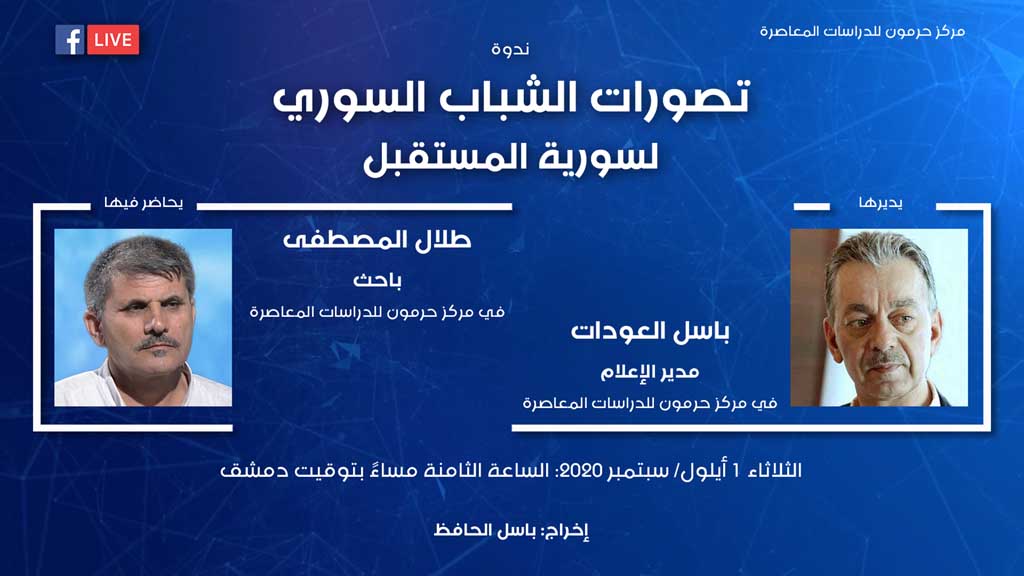 ضمن سلسلة الندوات التي يعقدها مركز حرمون للدراسات المعاصرة عبر البث المباشر، تُقام يوم الثلاثاء 1 أيلول/ سبتمبر 2020، ندوة بعنوان “تصورات الشباب السوري لسورية المستقبل“، يُشارك فيها طلال المصطفى، الدكتور في علم الاجتماع والباحث في مركز حرمون، ويديرها باسل العودات، مدير الإعلام في مركز حرمون للدراسات المعاصرة.