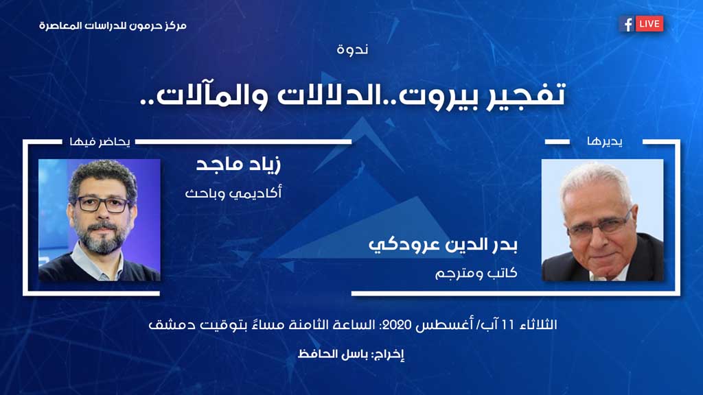 ضمن سلسلة الندوات التي يعقدها مركز حرمون للدراسات المعاصرة عبر البث المباشر، تقام يوم الثلاثاء المقبل، 11 آب/ أغسطس 2020، ندوة بعنوان “تفجير بيروت… الدلالات والمآلات“، يُشارك فيها من باريس زياد ماجد، ويقدمها بدر الدين عرودكي.