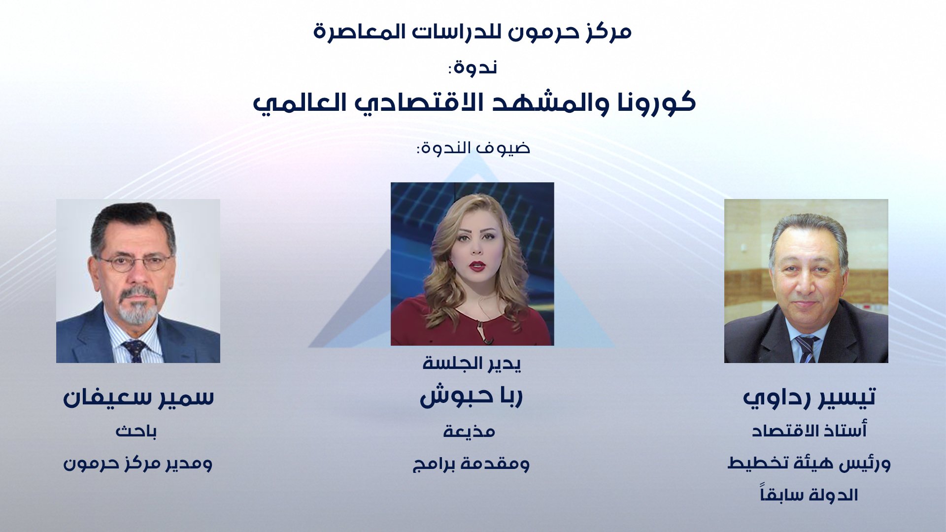 ضمن سلسلة الندوات التي يعقدها مركز حرمون للدراسات المعاصرة عبر البث المباشر، تُقام يوم السبت المقبل، 9 أيار/ مايو 2020، ندوة بعنوان “كورونا والمشهد الاقتصادي العالمي“، يُشارك فيها من برلين الباحث سمير سعيفان، مدير مركز حرمون للدراسات، ومن الدوحة أستاذ الاقتصاد ورئيس هيئة تخطيط الدولة سابقًا د. تيسير رداوي، وتديرها الإعلامية ربا حبوش.