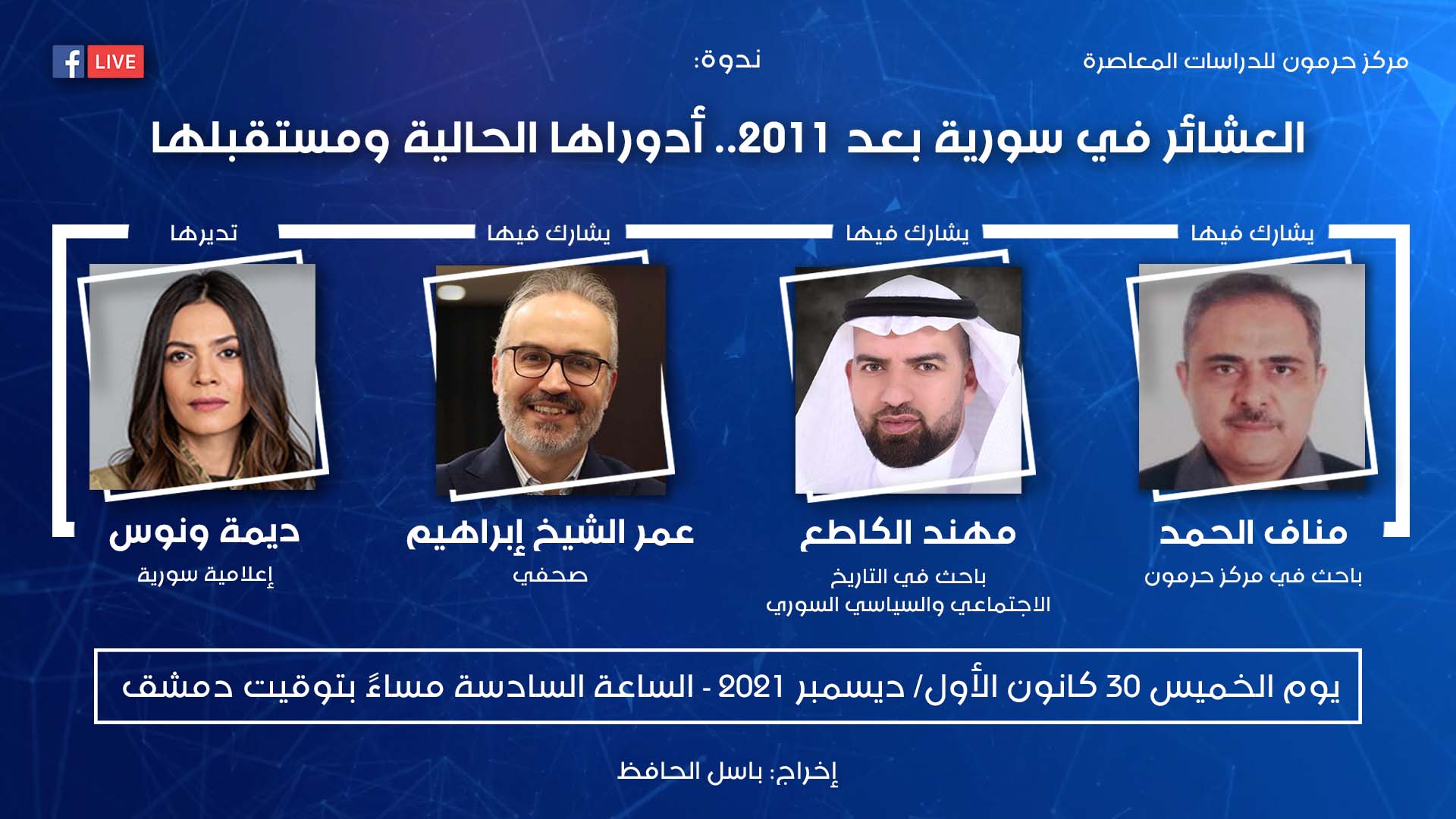 يعقد مركز حرمون للدراسات المعاصرة، يوم الخميس 30 كانون الأول/ ديسمبر 2021، الساعة السادسة مساءً بتوقيت دمشق، ندوة بعنوان “العشائر في سورية بعد 2011.. أدوراها الحالية ومستقبلها”، يُشارك فيها مناف الحمد، باحث في مركز حرمون، ومهند الكاطع، باحث في التاريخ الاجتماعي والسياسي السوري، وعمر الشيخ إبراهيم، صحفي، وتُديرها ديمة ونوس، إعلامية سورية.
