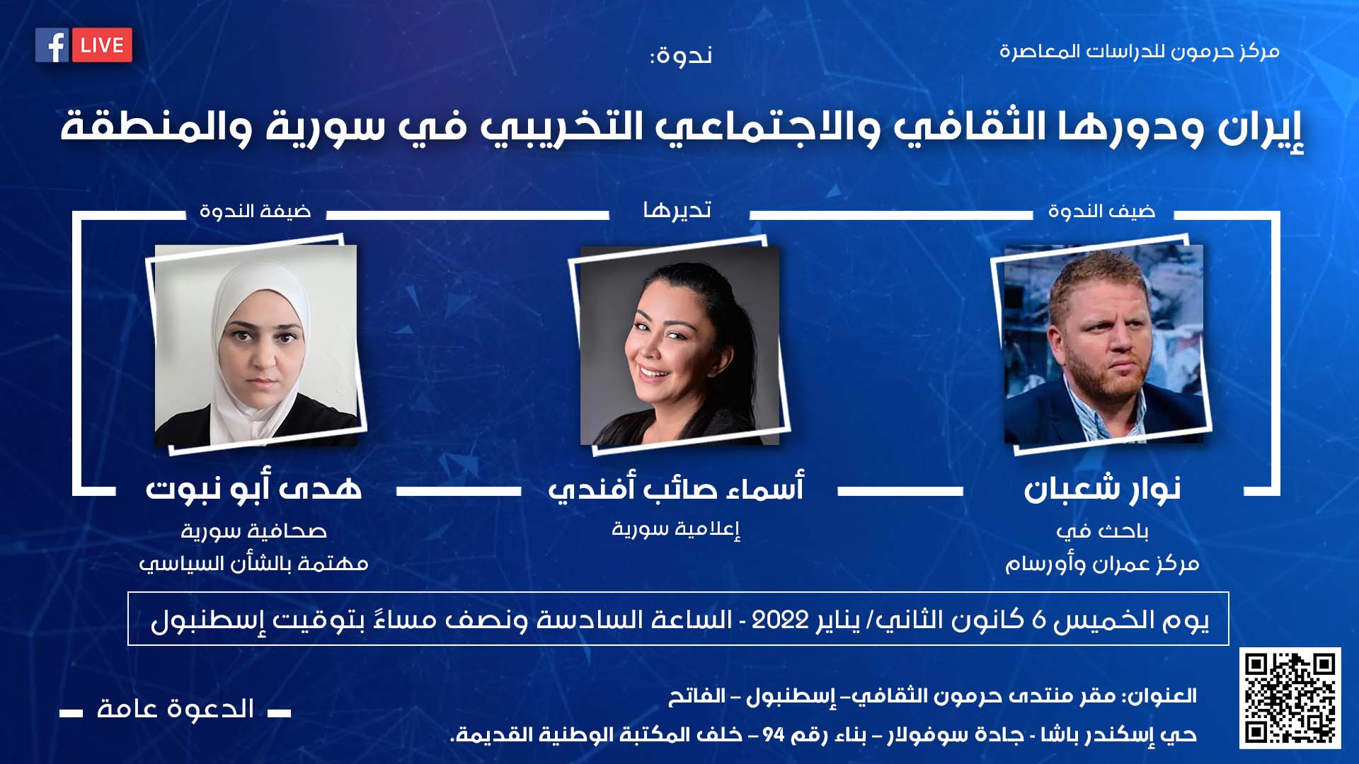 يعقد مركز حرمون للدراسات المعاصرة يوم الخميس 6 كانون الثاني/ يناير 2022، الساعة السادسة والنصف مساءً بتوقيت إسطنبول، ندوة بعنوان “إيران ودورها الثقافي والاجتماعي التخريبي في سورية والمنطقة“، يُشارك فيها نوار شعبان، الباحث في مركز عمران وأورسام، وهدى أبو نبوت، الصحافية السورية والمهتمة بالشأن السياسي، وتُديرها أسماء صائب أفندي، الإعلامية السورية.