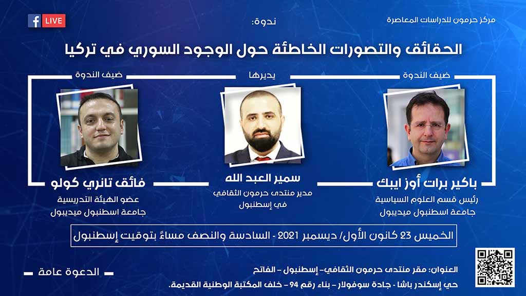 ضمن سلسلة الندوات التي يعقدها مركز حرمون للدراسات المعاصرة، عبر البث المباشر، تُقام يوم الخميس 23 كانون الأول/ ديسمبر 2021، الساعة الخامسة والنصف مساءً بتوقيت دمشق (السادسة والنصف بتوقيت إسطنبول)، ندوة بعنوان “الحقائق والتصورات الخاطئة حول الوجود السوري في تركيا”، يُشارك فيها باكير برات أوز ايبك، رئيس قسم العلوم السياسية في جامعة اسطنبول ميديبول، فائق تانري كولو، عضو الهيئة التدريسية بقسم العلوم السياسية في جامعة اسطنبول ميديبول، ويديرها سمير العبد الله، مدير منتدى حرمون الثقافي.
