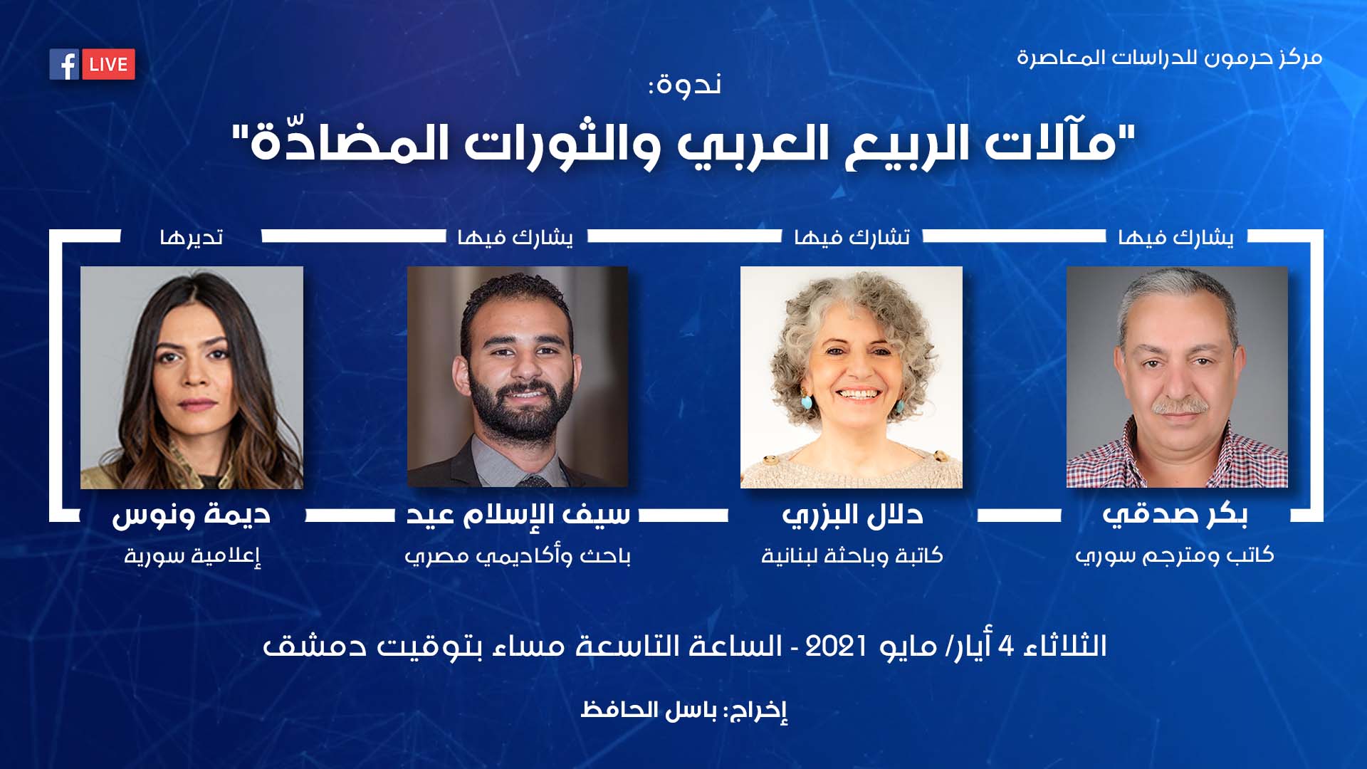 ضمن سلسلة الندوات التي يعقدها مركز حرمون للدراسات المعاصرة عبر البث المباشر، تُقام يوم الثلاثاء 4 أيار/ مايو 2021، الساعة التاسعة ليلًا بتوقيت دمشق، ندوة بعنوان “مآلات الربيع العربي والثورات المضادّة”، يُشارك فيها كل من الكاتبة والباحثة دلال البزري، الكاتب والمترجم بكر صدقي، الباحث والأكاديمي سيف الإسلام عيد، وتديرها ديمة ونوس، الإعلامية السورية.