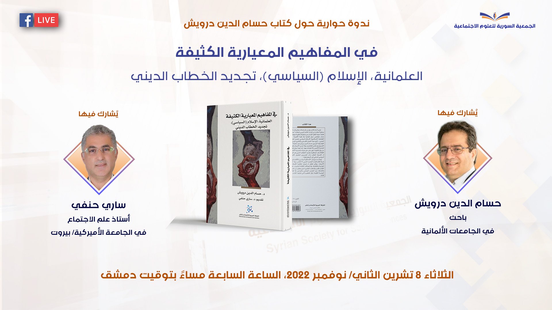 في إطار سلسلة الندوات الشهرية التي تعقدها الجمعية السورية للعلوم الاجتماعية، وتُبثّ مباشرة على وسائل التواصل الاجتماعي، تُعقد (بشكل استثنائي) يوم الثلاثاء 8 تشرين الثاني/ نوفمبر 2022، الساعة السابعة مساءً بتوقيت دمشق (الرابعة بتوقيت غرينتش)، ندوة حوارية حول كتاب “في المفاهيم المعيارية الكثيفة: العلمانية، الإسلام (السياسي)، تجديد الخطاب الديني”.