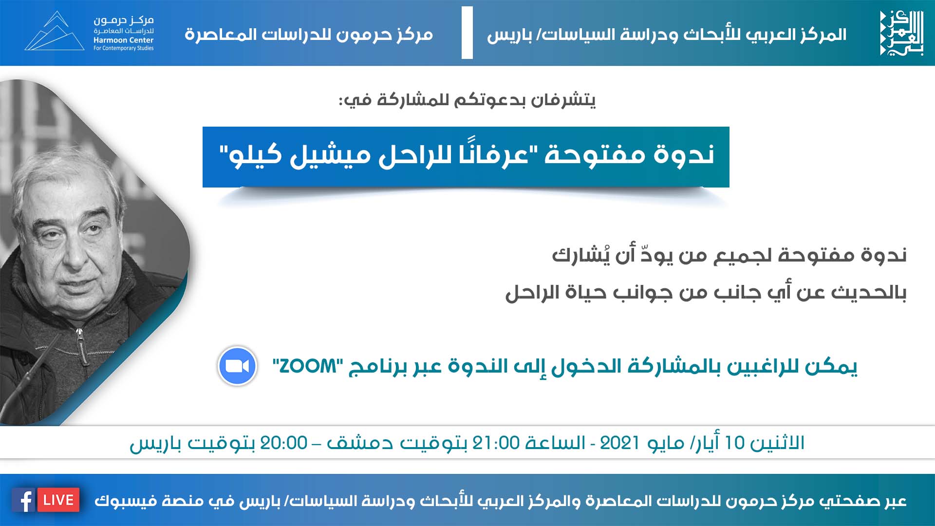 يتشرف كل من المركز العربي للأبحاث ودراسة السياسات/ باريس، ومركز حرمون للدراسات المعاصرة، بدعوتكم لمتابعة ندوة مفتوحة بعنوان “عرفانًا للراحل ميشيل كيلو”، يوم الاثنين 10 أيار/ مايو 2021، الساعة 21:00 بتوقيت دمشق – 20:00 بتوقيت باريس.