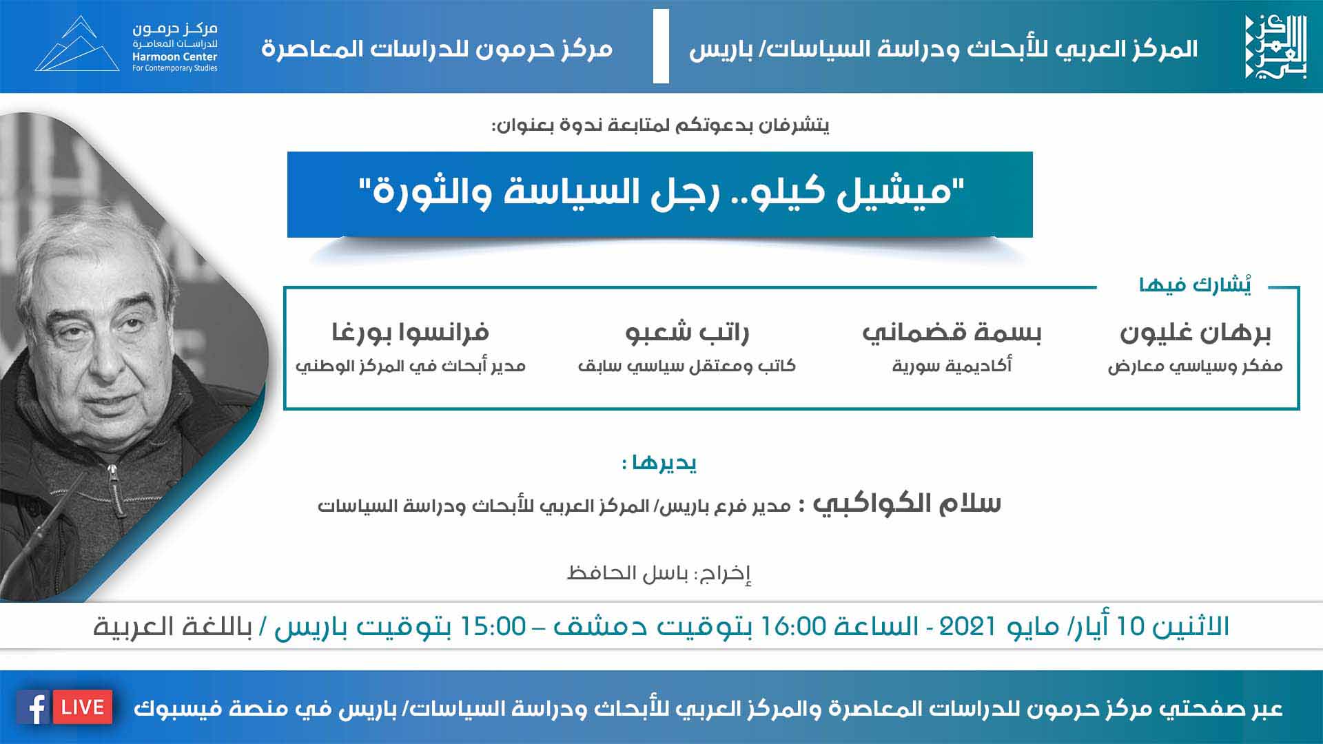 يتشرف كل من المركز العربي للأبحاث ودراسة السياسات/ باريس، ومركز حرمون للدراسات المعاصرة، بدعوتكم لمتابعة ندوة بعنوان “ميشيل كيلو.. رجل السياسة والثورة“، يوم الاثنين 10 أيار/ مايو 2021، الساعة 16:00 بتوقيت دمشق – 15:00 بتوقيت باريس.