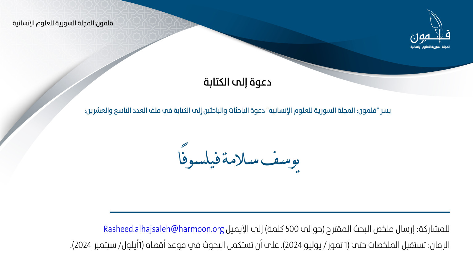تحت مظلة هذه الحدوس الفلسفية الخالصة، وفي ضوء هذه المفهومات التنويرية والعملية والتفكيكية، وتكريمًا لواحد من الفلاسفة والأساتذة العرب؛ تدعو مجلة قلمون الباحثات والباحثين إلى المشاركة في ملف العدد التاسع والعشرين بعنوان ((يوسف سلامة فيلسوفًا)) من خلال الكتابة في أحد المحاور الآتية: