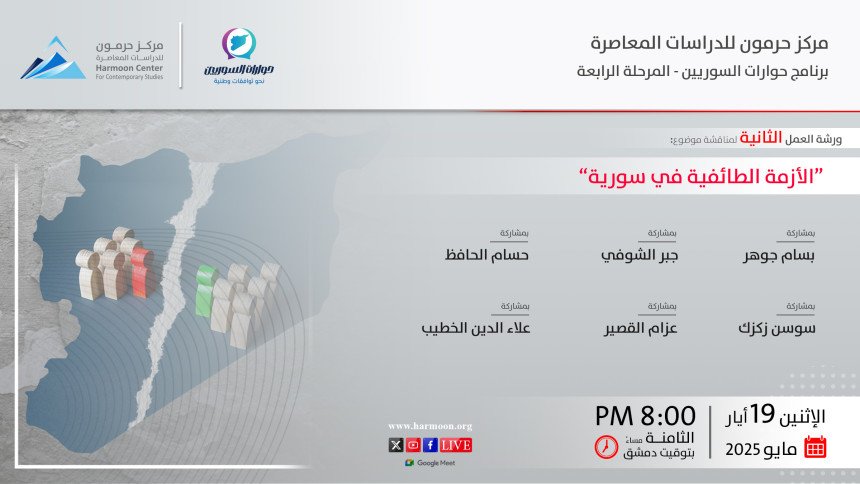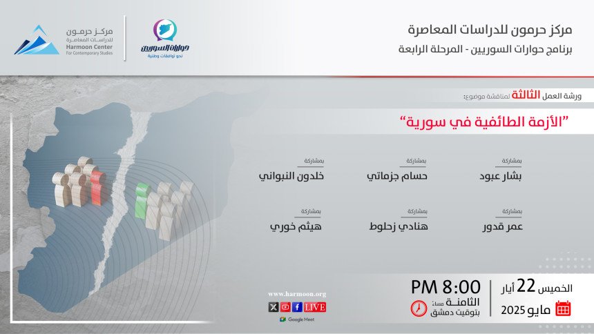ينظم برنامج “حوارات السوريين” في مركز حرمون للدراسات المعاصرة، يوم الخميس 22 أيار/ مايو 2025، الساعة الثامنة مساء بتوقيت دمشق، ورشة العمل الثالثة (أونلاين) في موضوع “الأزمة الطائفية في سورية”. يشارك في النقاش نخبة من الباحثين والمهتمين، وهم (حسب التسلسل الأبجدي، مع حفظ الألقاب): بشار عبود، إعلامي وسياسي؛ حسام جزماتي، كاتب وباحث متخصص في الحركات الإسلامية؛ خلدون النبواني، أكاديمي وباحث-…