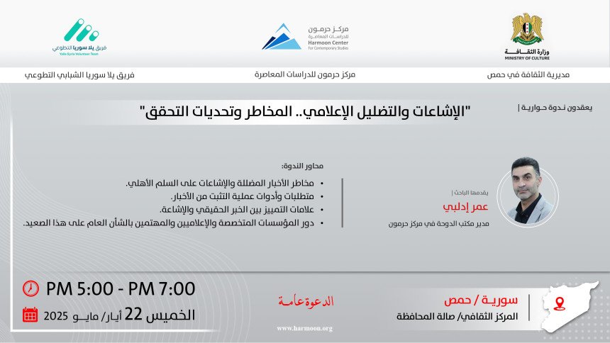 يقيم مركز حرمون للدراسات المعاصرة، بالتعاون مع فريق "يلا سوريا" الشبابي التطوعي في حمص، ومديرية الثقافة في حمص، يوم الخميس 22 أيار/ مايو 2025، ندوة بعنوان "الإشاعات والتضليل الإعلامي.. المخاطر وتحديات التحقق". يقدّم الندوة الباحث عمر إدلبي، مدير مكتب الدوحة في مركز حرمون للدراسات المعاصرة، ويتناول فيها أخطار الأخبار المضللة والإشاعات على السِّلم الأهلي، ومتطلبات عملية التثبت من الأخبار وأدواتها،…