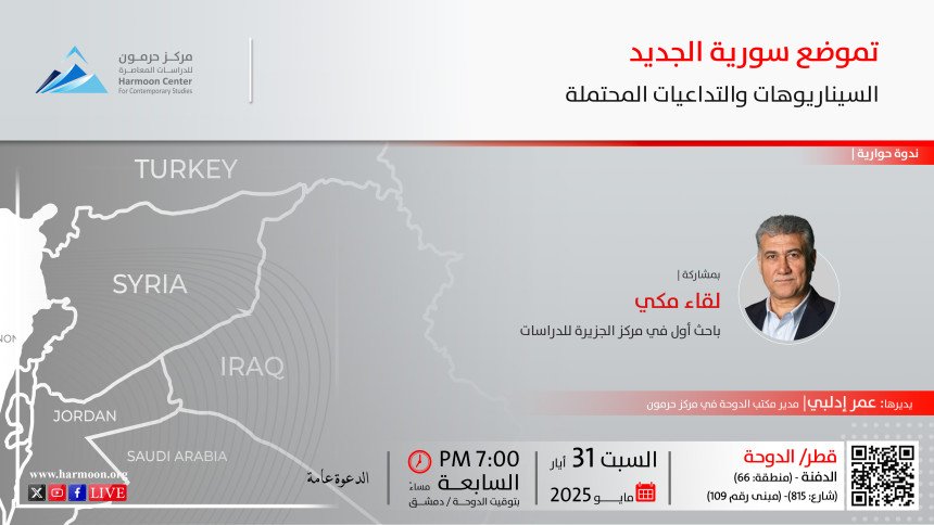 يعقد مركز حرمون للدراسات المعاصرة، يوم السبت 31 أيار/ مايو 2025، السابعة مساءً بتوقيت دمشق، في مقره بالعاصمة القطرية الدوحة، ندوة حوارية بعنوان: "تموضع سورية الجديد.. السيناريوهات والتداعيات المحتملة". يستضيف فيها الدكتور لقاء مكي، الباحث الأول في مركز الجزيرة للدراسات، ويديرها عمر إدلبي، مدير مكتب الدوحة في مركز حرمون. وتتناول الندوة تحولات العلاقة بين الدولة السورية ومحيطها الإقليمي والدول الفاعلة،…