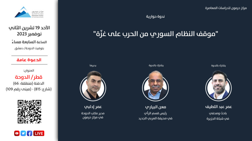يعقد مركز حرمون للدراسات المعاصرة، يوم الأحد 19 تشرين الثاني/ نوفمبر 2023، الساعة السابعة مساءً بتوقيت الدوحة/ دمشق، في مقرّه بالعاصمة القطرية الدوحة، ندوة حوارية بعنوان: "موقف النظام السوري من الحرب على غزة"، يشارك فيها معن البياري، رئيس قسم الرأي في صحيفة العربي الجديد؛ وعمر عبد اللطيف، باحث وصحفي في شبكة الجزيرة، ويديرها عمر إدلبي، مدير مكتب الدوحة في مركز حرمون للدراسات المعاصرة...