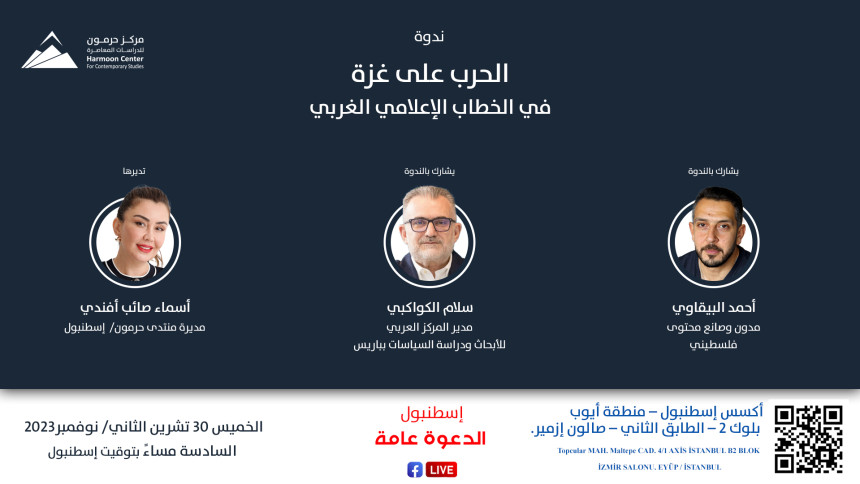 يعقد مركز حرمون للدراسات المعاصرة، يوم الخميس 30 تشرين الثاني / نوفمبر 2023، الساعة السادسة مساءً بتوقيت إسطنبول، ندوة حوارية بعنوان (الحرب على غزة في الخطاب الإعلامي الغربي)، يشارك فيها سلام الكواكبي، مدير المركز العربي للأبحاث ودراسة السياسات بباريس؛ وأحمد البيقاوي، مدوّن وصانع محتوى فلسطيني؛ وتديرها أسماء صائب أفندي، مديرة منتدى حرمون في إسطنبول.