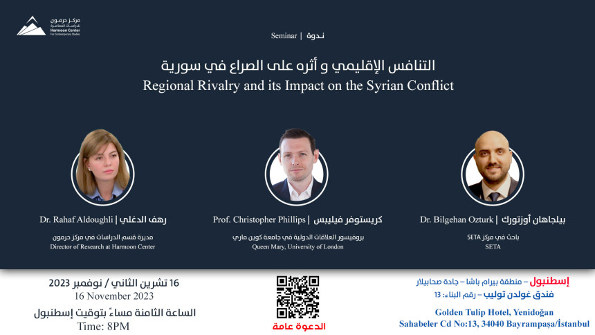 ينظّم مركز حرمون للدراسات المعاصرة، يوم الخميس 16 تشرين الثاني/ نوفمبر 2023، الساعة الثامنة مساءً بتوقيت إسطنبول، ندوة بعنوان “التنافس الإقليمي وأثره على الصراع في سورية”، يشارك فيها كلّ من كريستوفر فيليبس، بروفيسور العلاقات الدولية في جامعة كوين ماري؛ و بيلجاهان أوزتورك، باحث في مركز SETA للدراسات؛ ورهف الدغلي، مديرة قسم الدراسات في مركز حرمون. الدعوة عامة، وستكون خدمة الترجمة…