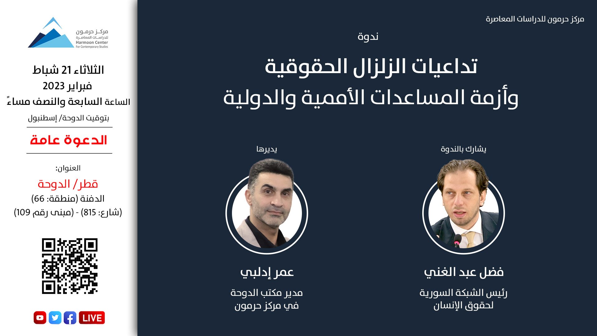 يعقد مركز حرمون للدراسات المعاصرة، يوم الثلاثاء 21 شباط/ فبراير 2023، الساعة السابعة والنصف مساءً، بتوقيت الدوحة/ إسطنبول، ندوة بعنوان "تداعيات الزلزال الحقوقية وأزمة المساعدات الأممية والدولية"، مع فضل عبد الغني، رئيس الشبكة السورية لحقوق الإنسان، ويديرها عمر إدلبي، مدير مكتب الدوحة في مركز حرمون.