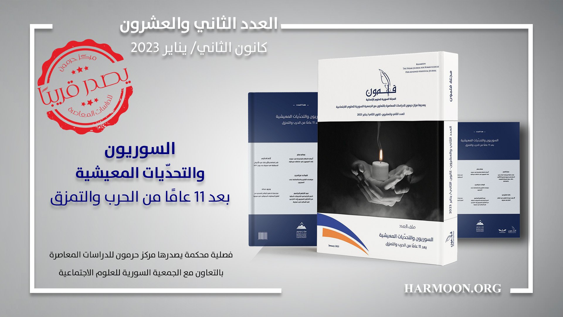 ترقبوا صدور العدد الثاني والعشرين من "قلمون: المجلة السورية للعلوم الإنسانية" قريبًا، وعنوان ملفه الرئيس: (السوريون والتحدّيات المعيشية بعد 11 عامًا من الحرب والتمزق). وقد عُني هذا الملف باستخدام النظام التجويع والإفقار أداتين في حربه على السوريين، إضافة إلى سياسات وأدوات أخرى...