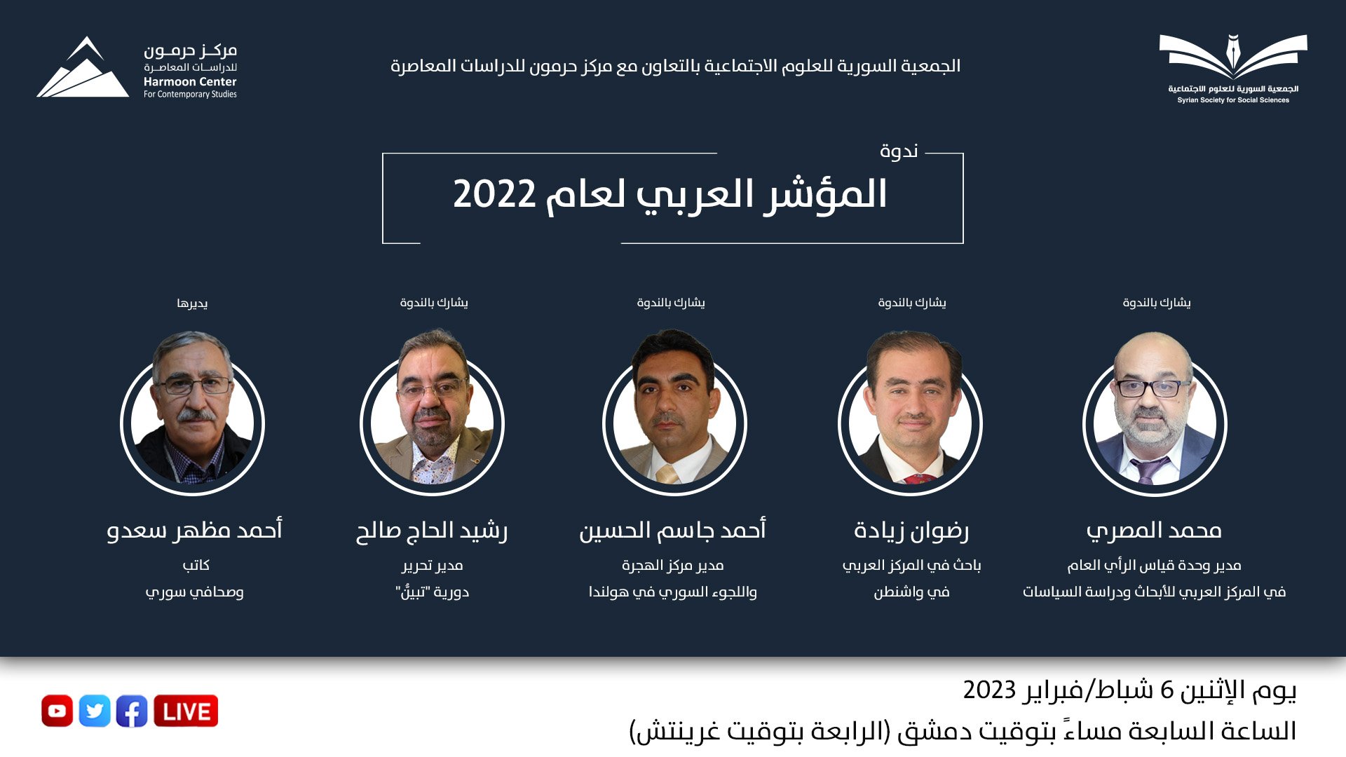 في إطار سلسلة الندوات الشهرية التي تعقدها الجمعية السورية للعلوم الاجتماعية، الاثنين الأول من كل شهر، بالتعاون مع مركز حرمون للدراسات المعاصرة، وتبثّها مباشرة على وسائل التواصل الاجتماعي، تُعقَد ندوة يوم الاثنين 6 شباط/ فبراير 2023، الساعة السابعة مساءً بتوقيت دمشق (الرابعة بتوقيت غرينتش) بعنوان: المؤشر العربي لعام 2022...