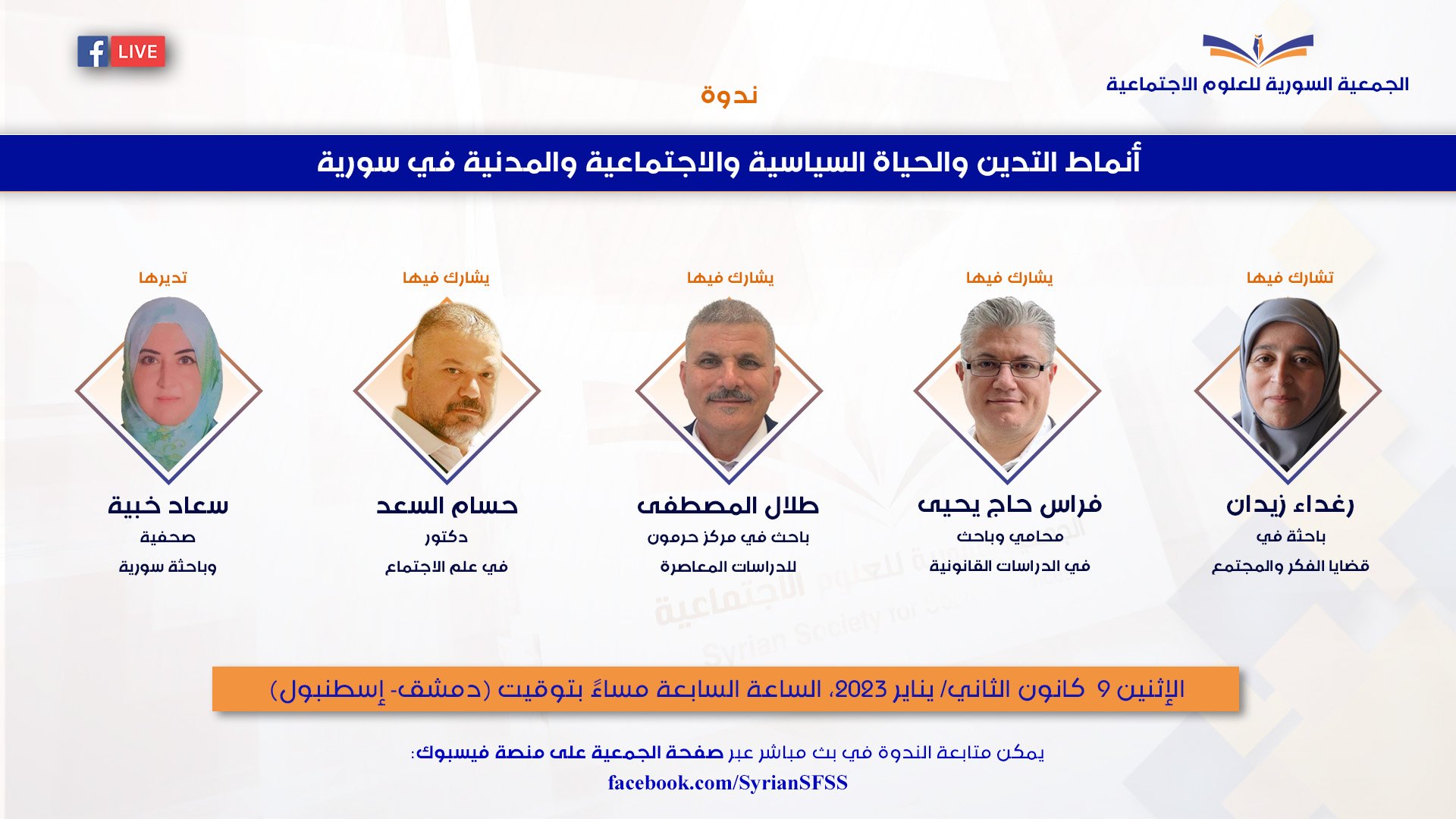 في إطار سلسلة الندوات الشهرية التي تعقدها الجمعية السورية للعلوم الاجتماعية، في الاثنين الأول من كل شهر، وتُبثّ مباشرة على وسائل التواصل الاجتماعي، تُعقَد ندوة يوم الاثنين 9 كانون الثاني/ يناير 2023، الساعة السابعة مساء بتوقيت دمشق- إسطنبول (الخامسة بتوقيت أوروبا، الرابعة بتوقيت غرينتش)، بعنوان: أنماط التديّن والحياة السياسية والاجتماعية والمدنية في سورية...