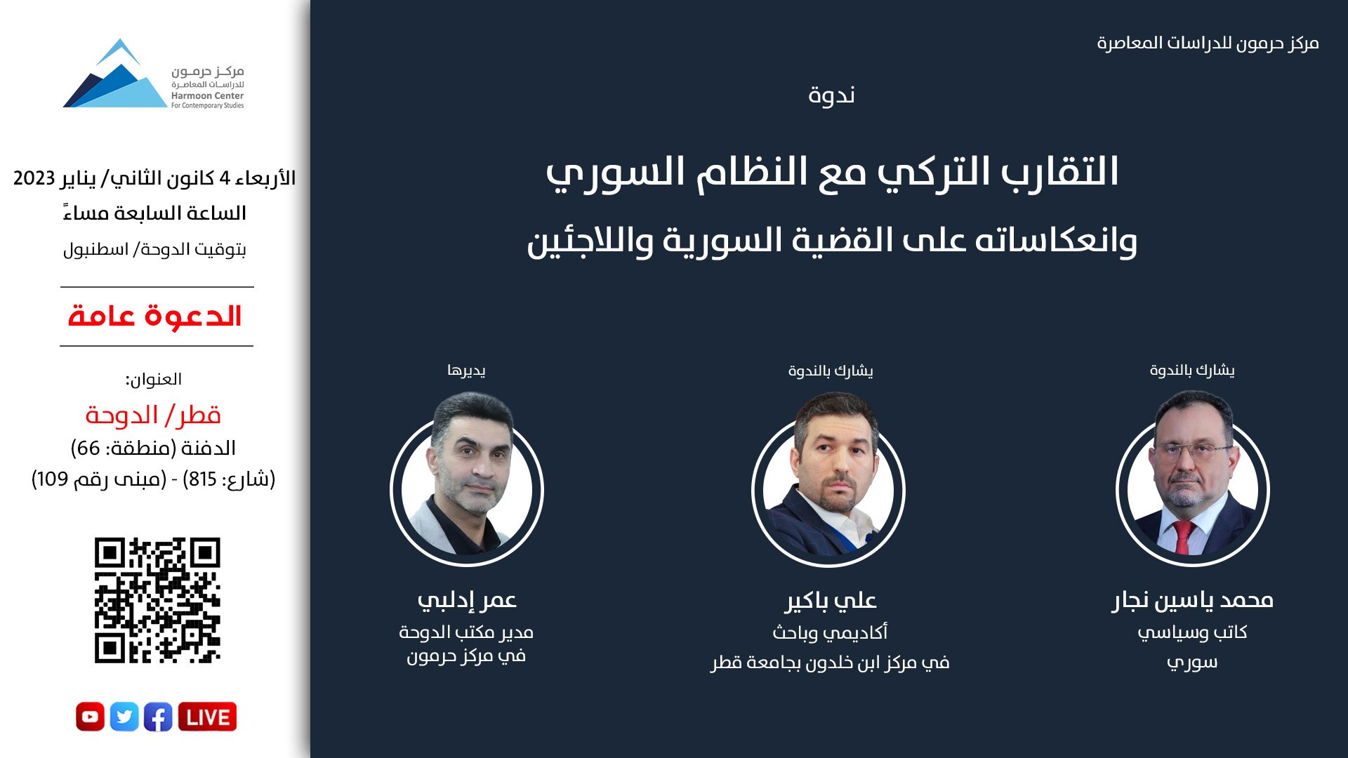 تتناول الندوة دوافع وتطورات التقارب التركي مع نظام الأسد، والخيارات المتاحة أمام المعارضة السورية بعد التحولات في علاقة تركيا مع النظام السوري، وانعكاساتها على القضية السورية واللاجئين.