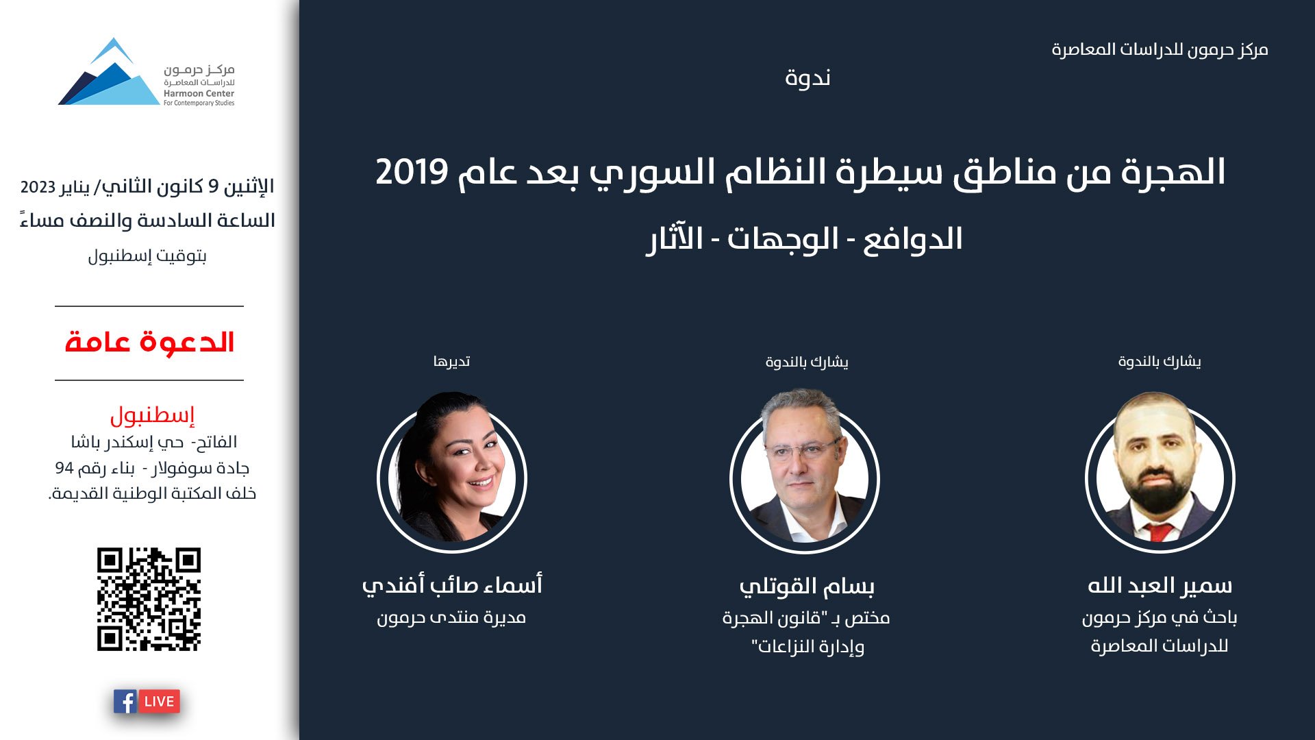 تناقش الندوة أسباب ودوافع ظاهرة الهجرة من مناطق النظام السوري بعد عام 2019، والطرق والوجهات التي يقصدها المهاجرون من تلك المناطق، والآثار التي تتركها هذه الهجرة على المجتمع والمهاجر نفسه.
