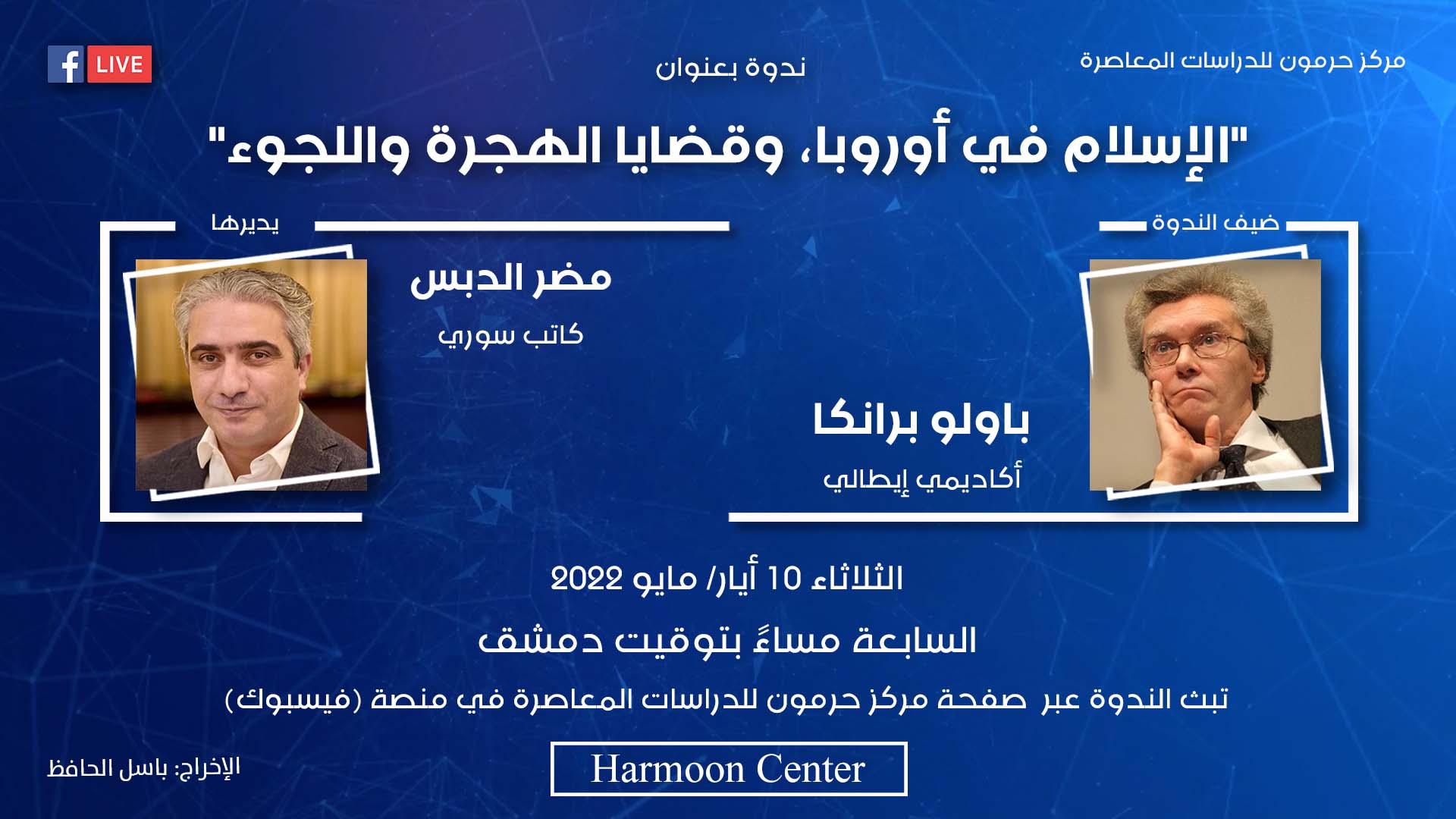 يعقد مركز حرمون للدراسات المعاصرة، يوم الثلاثاء 10 أيار/ مايو 2022، الساعة السابعة مساءً بتوقيت الدوحة، ندوة بعنوان "الإسلام في أوروبا، وقضايا الهجرة واللجوء"، يُشارك فيها باولو برانكا الأستاذ الجامعي في الجامعة الكاثوليكية في إيطاليا، ويحاوره الكاتب السوري مضر الدبس.