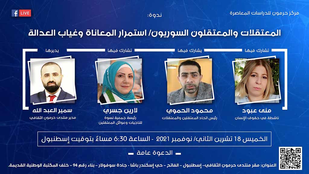 ندوة لمنتدى حرمون الثقافي بعنوان “المعتقلات والمعتقلون السوريون.. استمرار المعاناة وغياب العدالة”