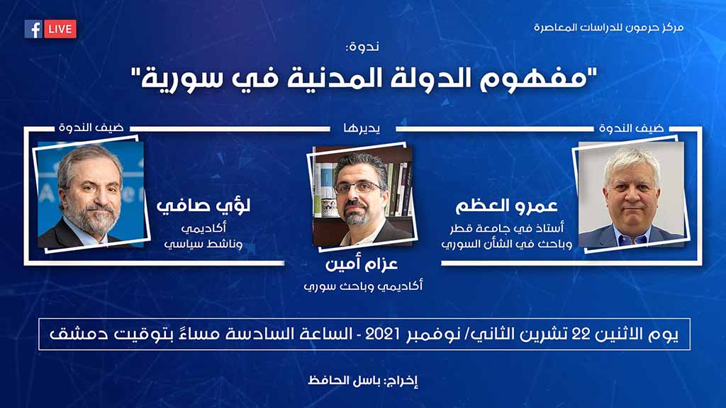ندوة لمنتدى حرمون الثقافي – الدوحة بعنوان: "مفهوم الدولة المدنية في سورية" يُشارك فيها كلّ من لؤي صافي، وعمرو العظم، ويديرها عزام أمين الاثنين 22 تشرين الثاني/ نوفمبر 2021 الساعة 6:00 مساءً بتوقيت دمشق