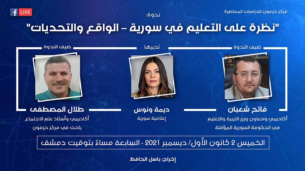 ندوة بعنوان "نظرة على التعليم في سورية – الواقع والتحديات" يُشارك فيها فاتح شعبان وطلال المصطفى الخميس 2 كانون الأول/ ديسمبر 2021 السابعة مساءً بتوقيت دمشق
