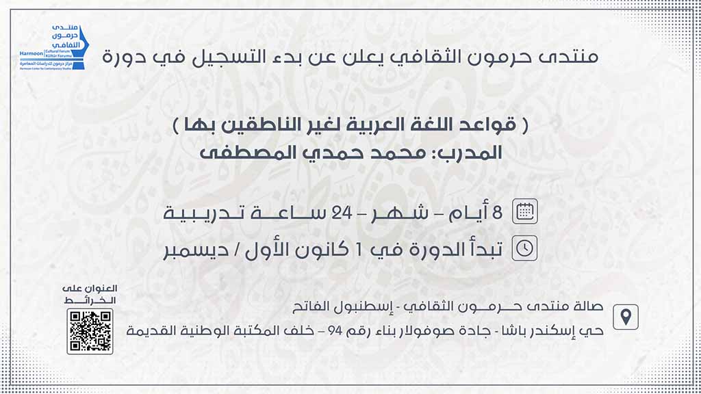 يقيم منتدى حرمون الثقافي دورة تدريبية بعنوان: (قواعد اللغة العربية للناطقين بغيرها)، وتستهدف طلاب الجامعات الذين يتعلمون اللغة العربية، وتهدف إلى تطوير مهارات فهم قواعد اللغة العربية لديهم.