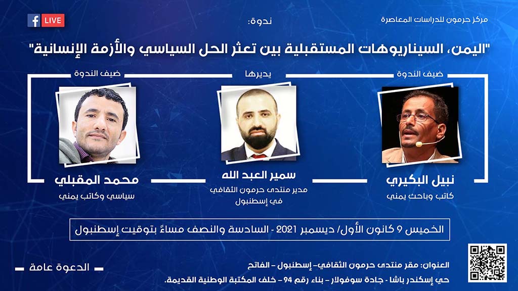 ندوة لحرمون بعنوان: "اليمن.. السيناريوهات المستقبلية بين تعثر الحل السياسي والأزمة الإنسانية" يُشارك فيها نبيل البكيري ومحمد المقبلي الخميس 9 كانون الأول/ ديسمبر 2021 السادسة والنصف مساءً بتوقيت إسطنبول
