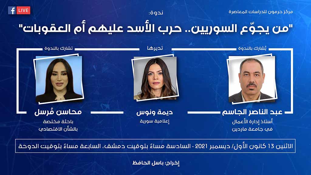 ندوة بعنوان "من يجوّع السوريين.. حرب الأسد عليهم أم العقوبات" يُشارك فيها عبد الناصر الجاسم، ومحاسن مُرسل. الاثنين 13 كانون الأول/ ديسمبر 2021 السادسة مساءً بتوقيت دمشق