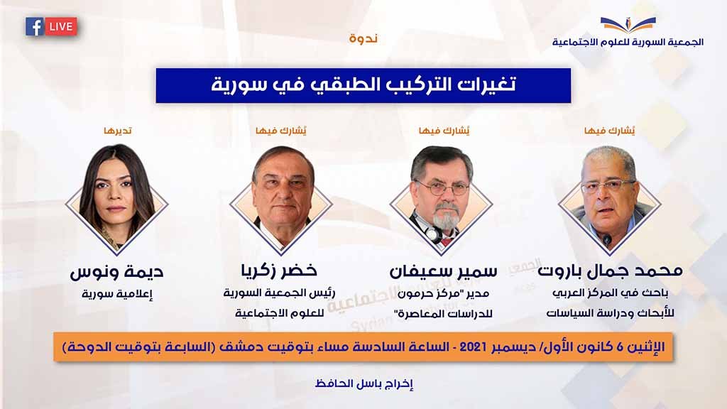 ندوة للجمعية السورية للعلوم الاجتماعية بعنوان "تغيرات التركيب الطبقي في سورية" يُشارك فيها سمير سعيفان، محمد جمال باروت، وخضر زكريا الإثنين 6 كانون الأول/ ديسمبر 2021 السادسة مساء بتوقيت دمشق
