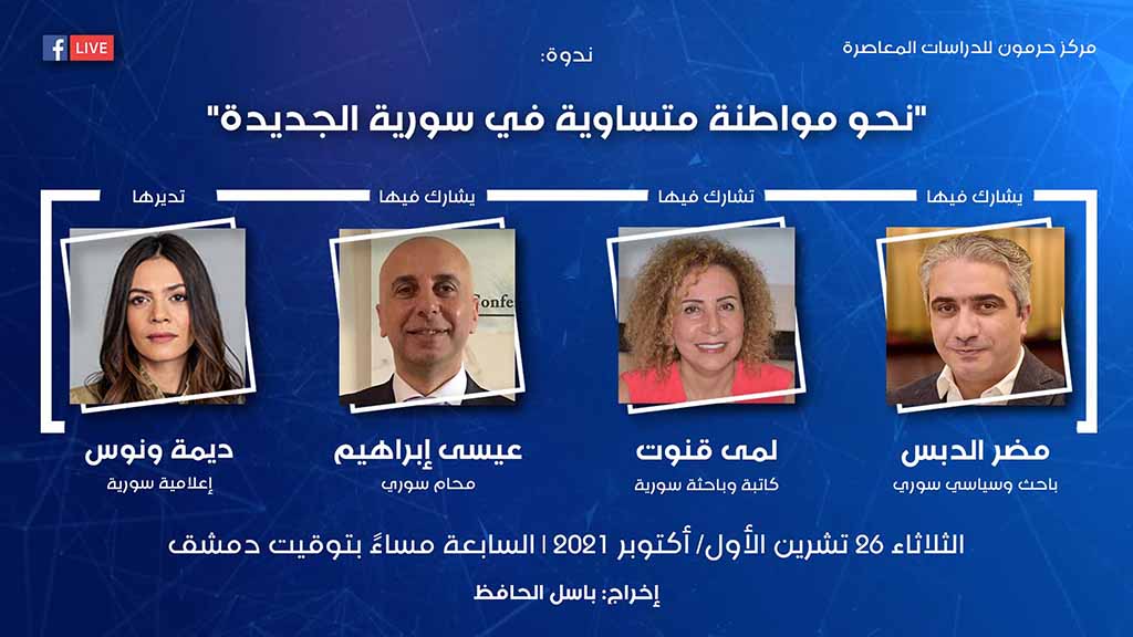 يقيم مركز حرمون ندوة بعنوان "نحو مواطنة متساوية في سورية الجديدة" يُشارك فيها عيسى إبراهيم، مضر الدبس، ولمى قنوت. الثلاثاء 26 تشرين الأول/ أكتوبر 2021 السابعة مساءً بتوقيت دمشق