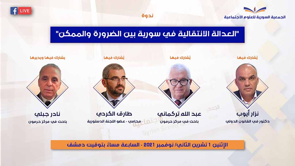 ندوة للجمعية السورية للعلوم الاجتماعية بعنوان "العدالة الانتقالية في سورية بين الضرورة والممكن". يُشارك فيها طارق الكردي، نزار أيوب، عبد الله تركماني، ونادر جبلي. الإثنين 1 تشرين الثاني/ نوفمبر 2021 السابعة مساءً بتوقيت دمشق