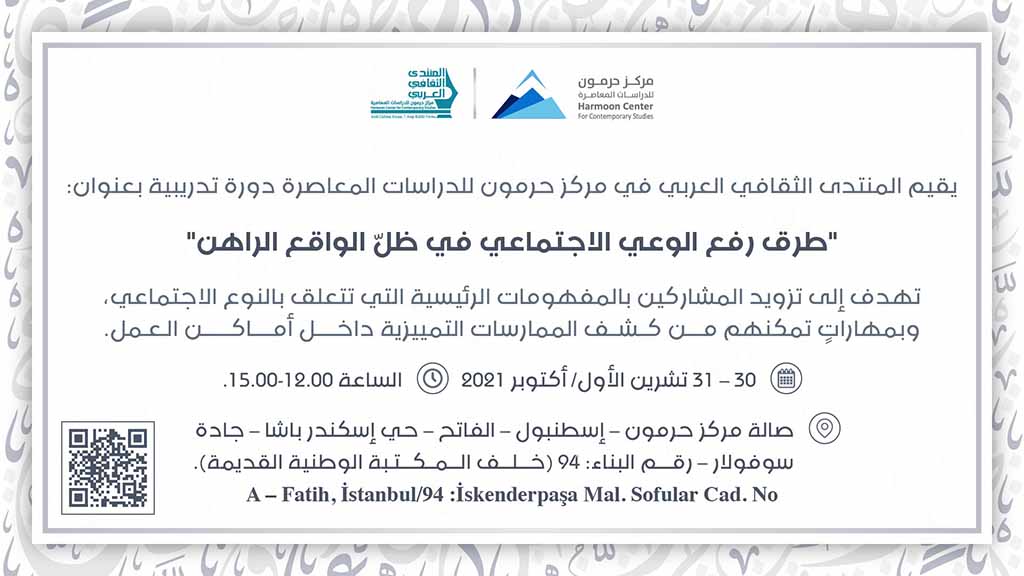 يقيم المنتدى الثقافي العربي التابع لمركز حرمون للدراسات المعاصرة دورة تدريبية بعنوان"طرق رفع الوعي الاجتماعي في ظلّ الواقع الراهن"، تهدف إلى تزويد المشاركين بالمفهومات الرئيسية التي تتعلق بالنوع الاجتماعي، ومهارات تطبيقها في أماكن العمل المدني. تاريخ بدء الدورة: 30 تشرين الأول/ أكتوبر 2021 رابط التسجيل: https://forms.office.com/r/WNwxGQhgWz