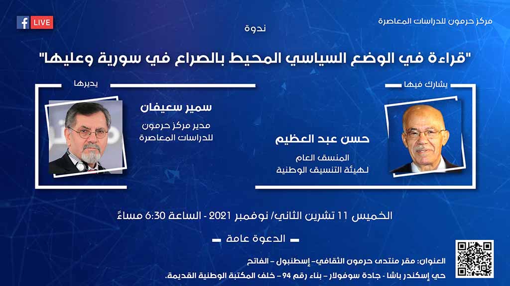 ندوة بعنوان: "قراءة في الوضع السياسي المحيط بالصراع في سورية وعليها" يُشارك فيها حسن عبد العظيم الخميس 11 تشرين الثاني/ نوفمبر 2021 الساعة 6:30 مساءً مقر منتدى حرمون الثقافي - الدعوة عامة