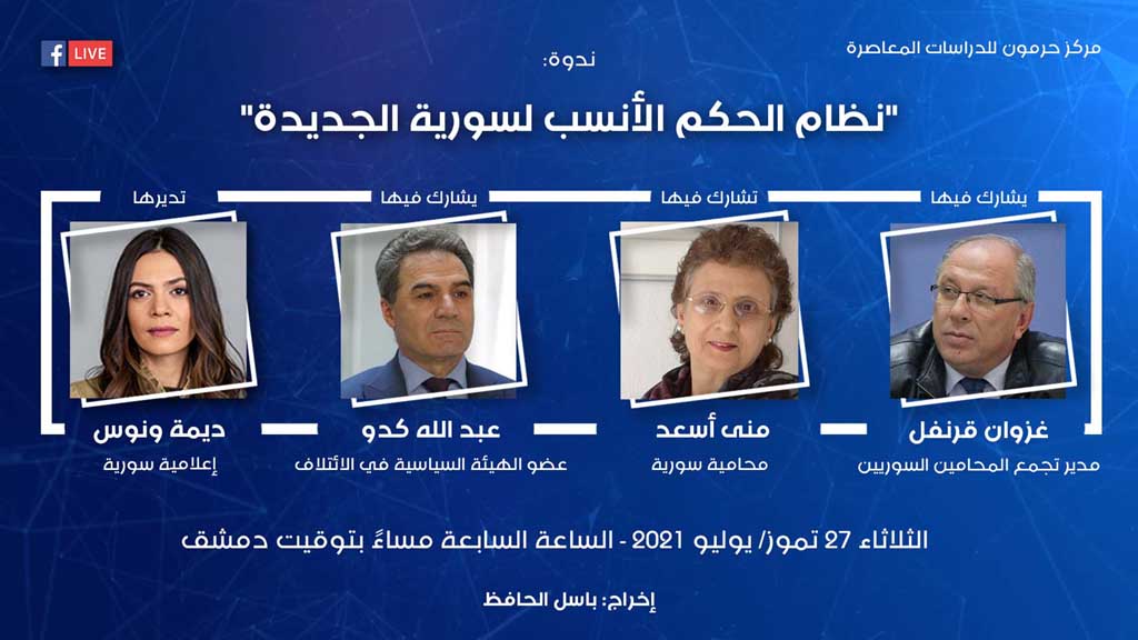 ندوة بعنوان "نظام الحكم الأنسب لسورية الجديدة" يُشارك فيها منى أسعد، غزوان قرنفل، وعبد الله كدو الثلاثاء 27 تموز/ يوليو 2021 الساعة السابعة مساءً بتوقيت دمشق
