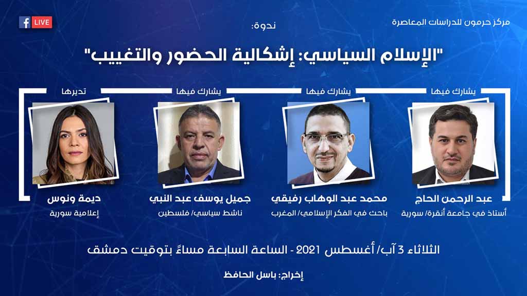يقيم مركز حرمون ندوة بعنوان "الإسلام السياسي: إشكالية الحضور والتغييب" يُشارك فيها جميل يوسف عبد النبي، عبد الرحمن الحاج، ومحمد عبد الوهاب رفيقي الثلاثاء 3 آب/ أغسطس 2021 الساعة السابعة مساءً بتوقيت دمشق