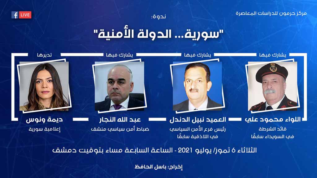 ندوة لحرمون بعنوان "سورية... الدولة الأمنية" يُشارك فيها كلّ من محمود علي ونبيل الدندل وعبد الله النجار. الثلاثاء 6 تموز/ يوليو 2021 الساعة السابعة مساءً بتوقيت دمشق
