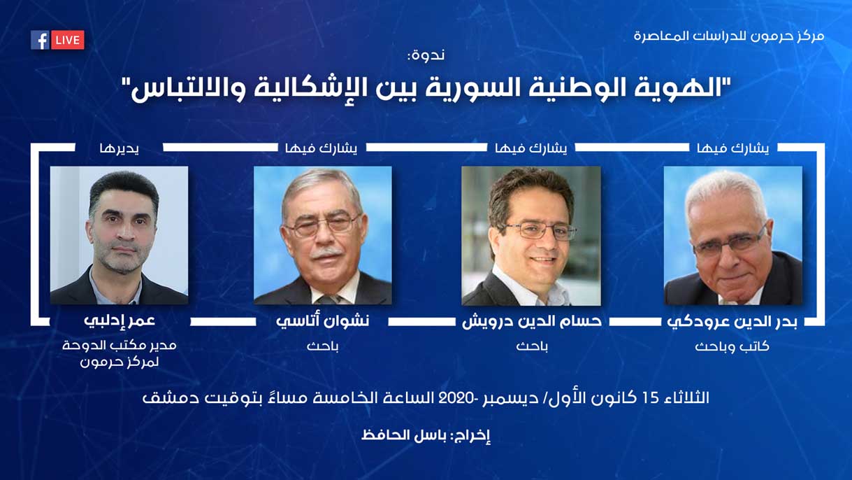 ندوة "الهوية الوطنية السورية بين الإشكالية والالتباس" يشارك فيها بدر الدين عرودكي، نشوان أتاسي، حسام الدين درويش، ويديرها عمر إدلبي. الثلاثاء 15 كانون الأول/ ديسمبر 2020 الساعة الخامسة مساءً بتوقيت دمشق