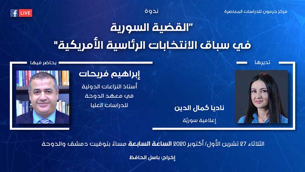 ندوة بعنوان: "القضية السورية في سباق الانتخابات الرئاسية الأميركية" يشارك فيها إبراهيم فريحات/ أستاذ النزاعات الدولية الثلاثاء 27 تشرين الأول/ أكتوبر 2020 الساعة 19:00 بتوقيت دمشق عبر صفحة المركز في (فيسبوك) للمركز