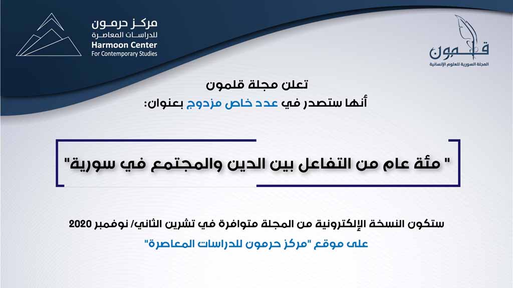 تعلن مجلة قلمون أنها ستصدر في عدد خاص مزدوج (الثالث عشر والرابع عشر) بعنوان "مئة عام من التفاعل بين الدين والمجتمع في سورية"، في شهر تشرين الثاني/ نوفمبر 2020.