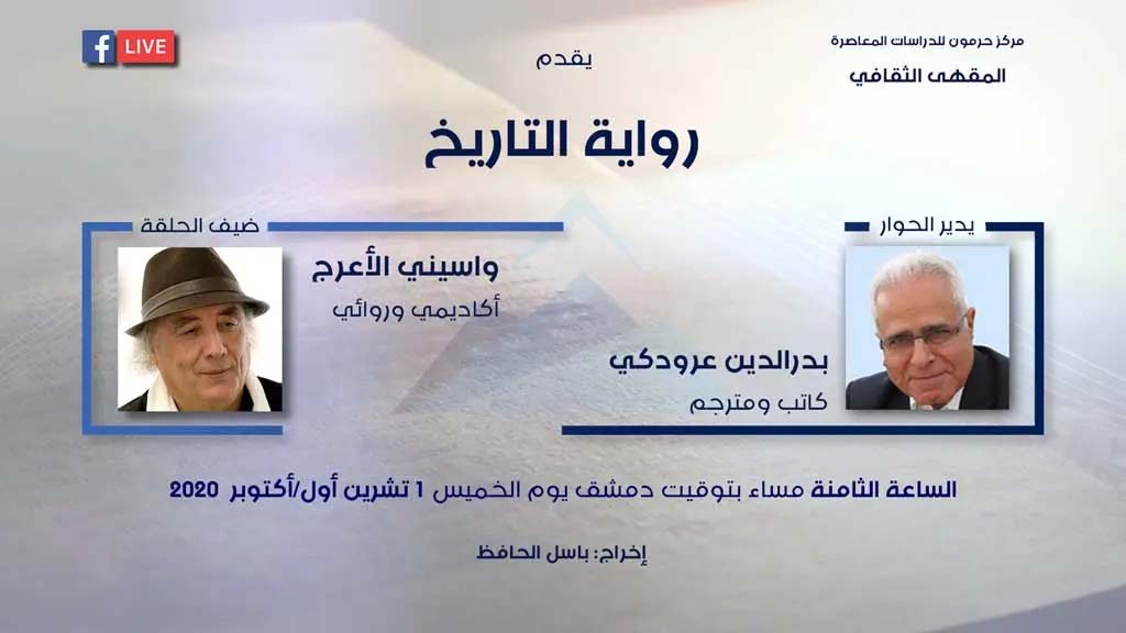 ستكونون على موعد يوم الخميس 1/ 10/ 2020 مع حلقة جديدة من برنامج "المقهى الثقافي" التابع لمركز حرمون للدراسات المعاصرة، وسيكون ضيف الحلقة الروائي الجزائري واسيني الأعرج.