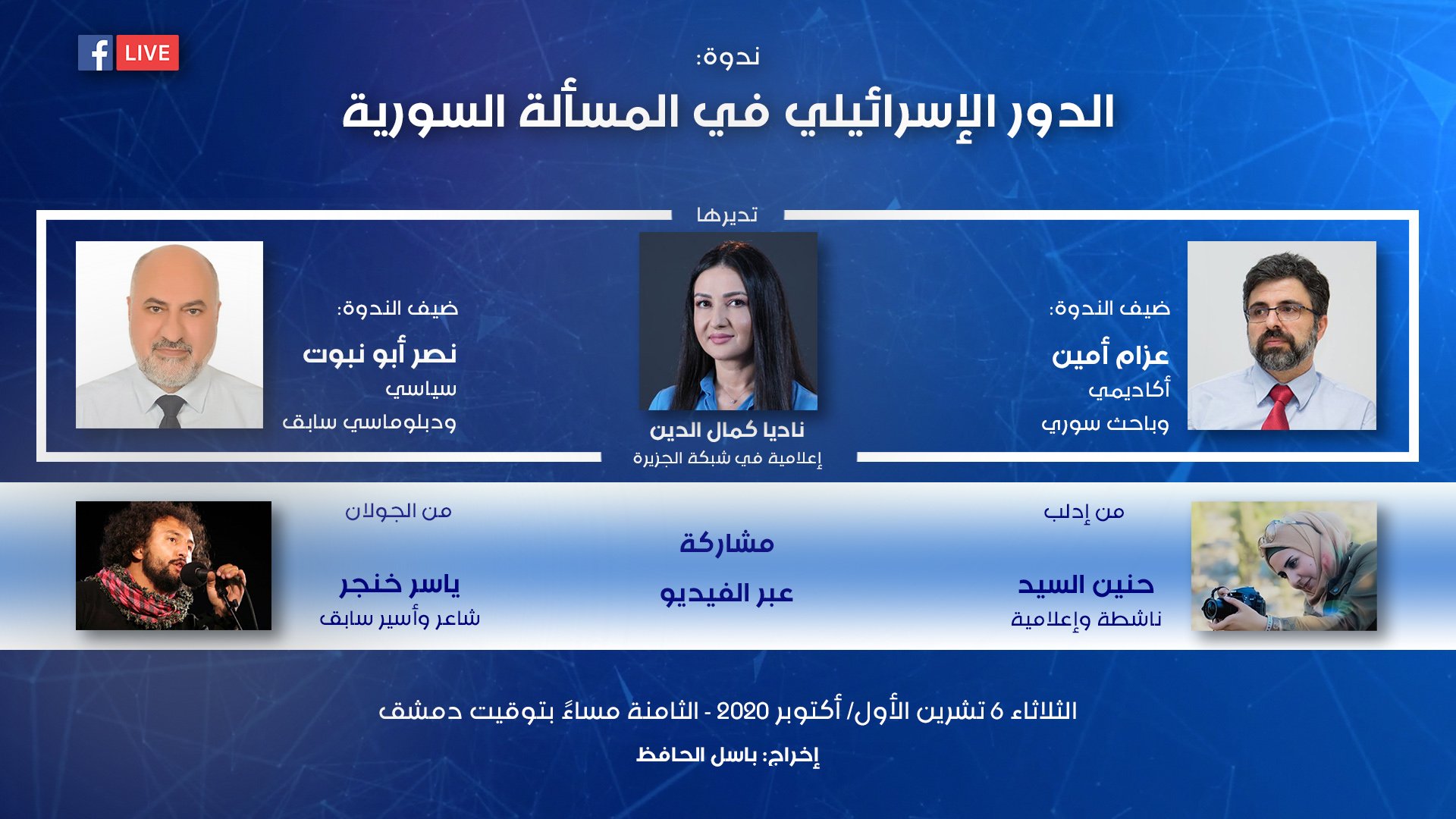 ندوة "الدور الإسرائيلي في المسألة السورية" يُقدمها عزام أمين ونصر أبو نبوت وتُديرها ناديا كمال الدين ويُشارك فيها حنين السيد وياسر خنجر الثلاثاء 6 تشرين الأول/ أكتوبر 2020 الساعة 20:00 بتوقيت دمشق