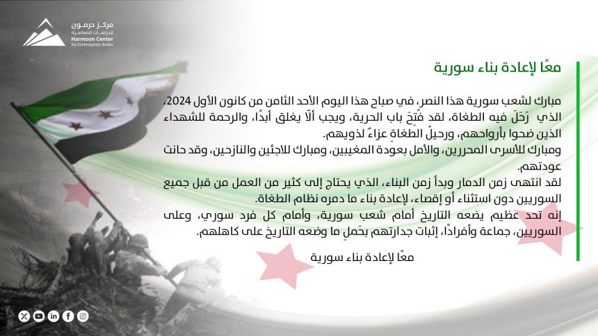 مبارك لشعب سورية هذا النصر، في صباح هذا اليوم الأحد الثامن من كانون الأول 2024، الذي رَحَلَ فيه الطغاة، لقد فُتِحَ باب الحرية، ويجب ألّا يغلق أبدًا، والرحمة للشهداء الذين ضحوا بأرواحهم، ورحيلُ الطغاةِ عزاءٌ لذويهم.ومبارك للأسرى المحررين، والأمل بعودة المغيبين، ومبارك للاجئين والنازحين، وقد حانت عودتهم.لقد انتهى زمن الدمار وبدأ زمن البناء، الذي يحتاج إلى كثير من العمل من…