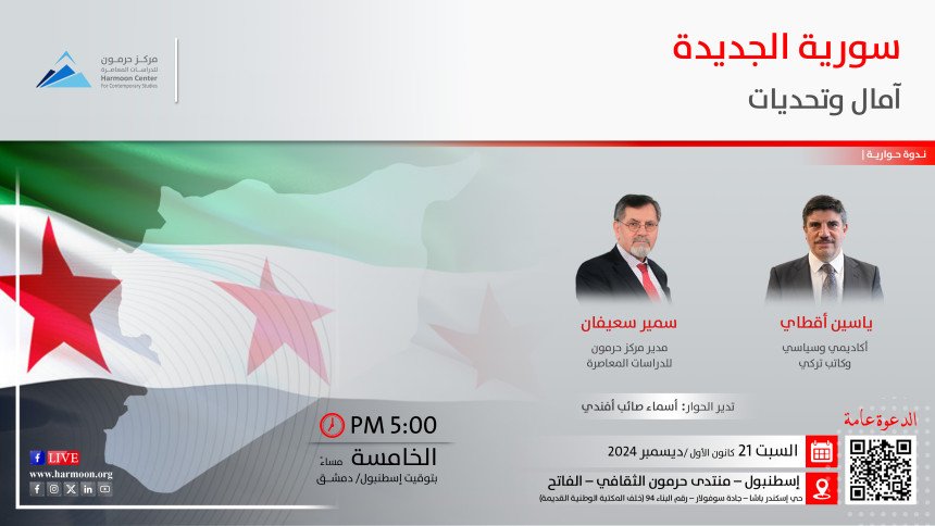ينظّم مركز حرمون للدراسات المعاصرة، السبت 21 كانون الأول/ ديسمبر 2024، الساعة الخامسة مساءً بتوقيت إسطنبول، فعالية خاصة بمناسبة تحرير سورية وإسقاط نظام الأسد. تبدأ الفعالية بكلمة افتتاحية يلقيها مدير المركز، السيد سمير سعيفان، تليها ندوة حوارية بعنوان "سورية الجديدة: آمال وتحديات"، يقدّمها الدكتور ياسين أقطاي، أكاديمي وسياسي وكاتب تركي، وتدير الندوة أسماء صائب أفندي، مديرة منتدى حرمون الثقافي في…