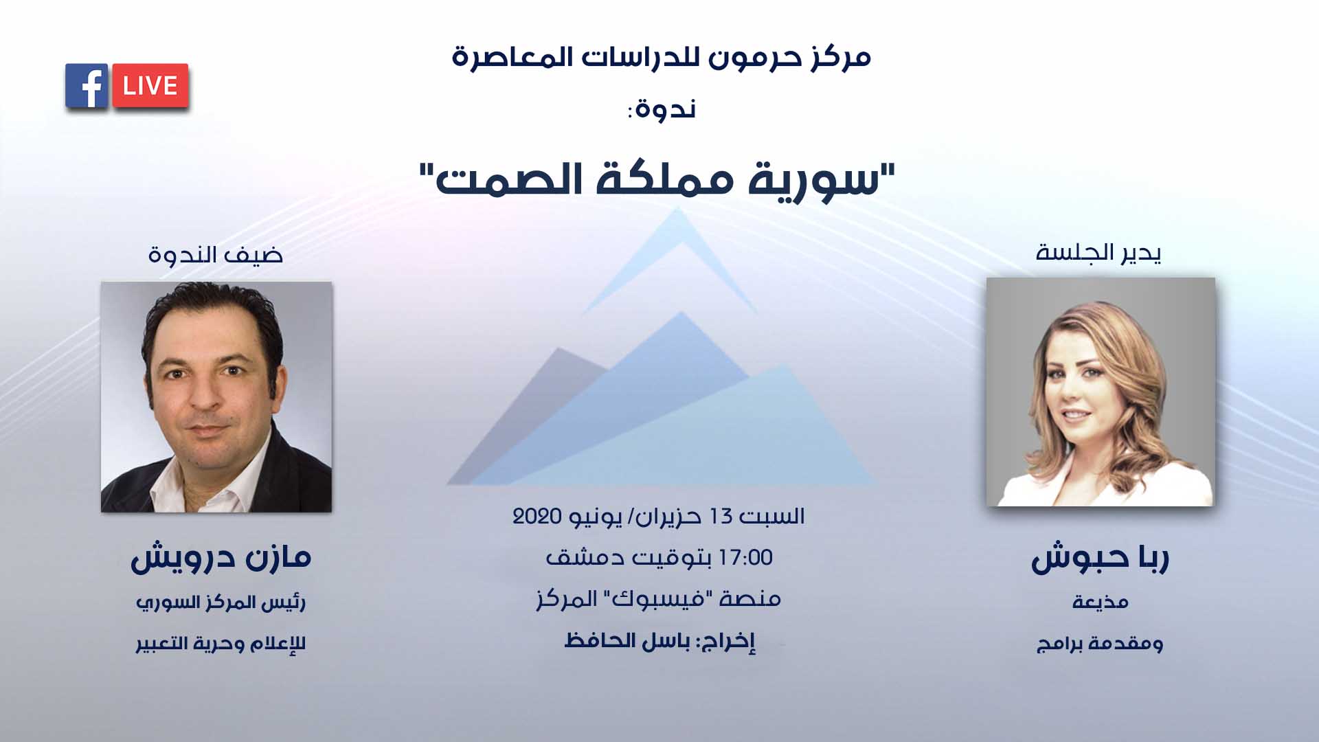 ضمن سلسلة ندوات مركز حرمون عبر البث المباشر، تُقام ندوة بعنوان "سورية مملكة الصمت"، يُشارك فيها الصحافي والمحامي مازن درويش، رئيس المركز السوري للإعلام وحرية التعبير.