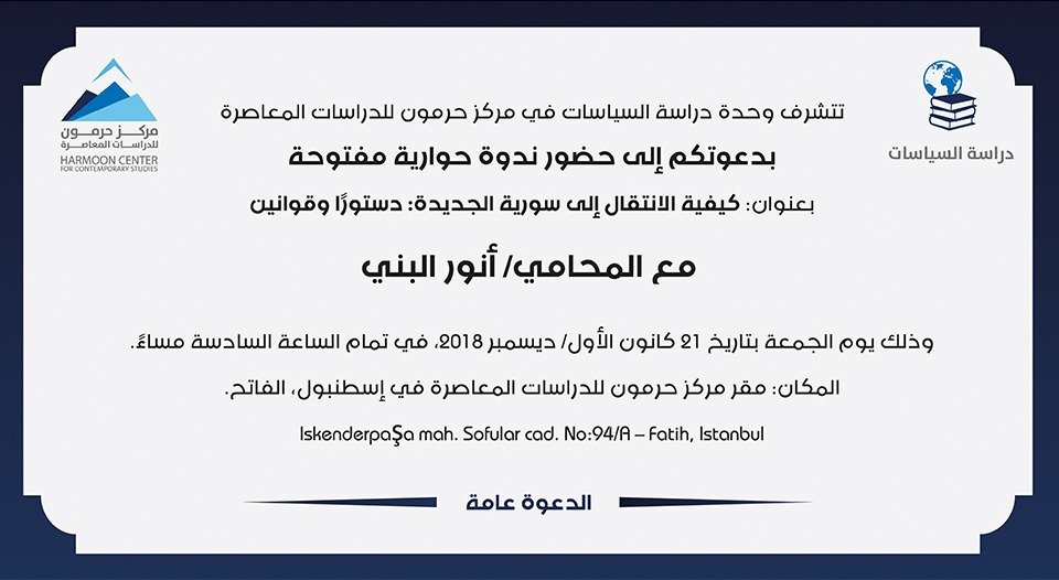 تنظم (وحدة دراسة السياسات)، التابعة لمركز حرمون للدراسات المعاصرة، يوم الجمعة المقبل 21 كانون الأول/ ديسمبر 2018، الساعة السادسة مساءً، ندوة حوارية مفتوحة مع المحامي أنور البني، تحت عنوان "كيفية الانتقال إلى سورية الجديدة: دستورًا وقوانين"، وذلك في مقر المركز في حي الفاتح بمدينة إسطنبول التركية. ستكون الدعوة عامة ومفتوحة لجميع الناشطين والسياسيين والإعلاميين والباحثين المهتمين بالشأن السوري. يُذكر أن الأستاذ…